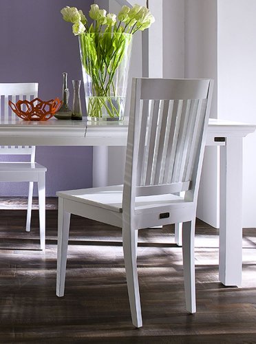 PRODUCT DESCRIPTIONS:Whitehaven Painted Slatback Dining Chairs (Pair). The epitome of quality craftsmanship and chic, striking looks, Whitehaven Painted furniture is hand-crafted using solid plantation Mahogany wood and man-made timbers, with a clean and contemporary, white painted finish. Made to order, this exclusive range offers a broad and varied selection of pieces for the entire home, ranging from beautiful yet practical dining room furniture to luxurious, yet understated bedroom furniture. The painted finish is offset with a classical touch. Made to order lead time is 8 weeks.