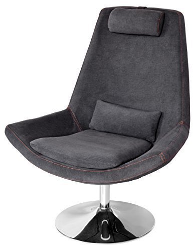 PRODUCT DESCRIPTIONS:This Leisure Chair has a very stylised eye catching design, can swivel 360 degrees and supported by a modern polished chrome base. The chair itself is very comfortable with additional back and head rest cushions, finished in a quality grey fabric with orange stitching.